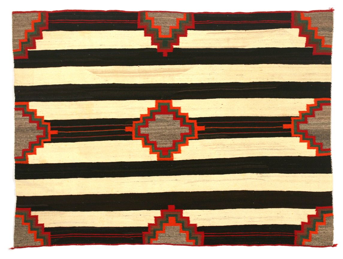 Navajo Third Phase Chief's Blanket. 5' x 4'1". Homespun yarns with commercial dyes. Full stepped diamond center & eight partial diamonds along the edges, over a banded background. Displays an unusual & rare green dye. Circa 1910. Condition reports can be viewed at www.marchinmontana.com/docs/2013CR.pdf