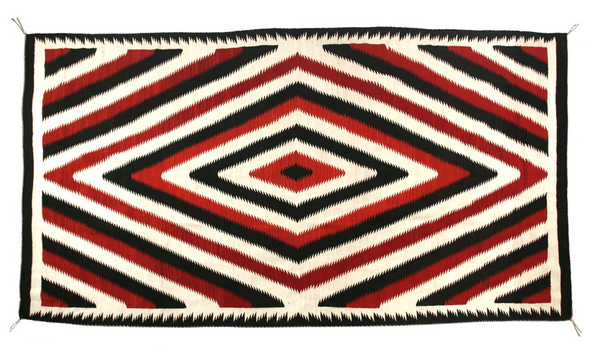 Navajo Weaving. 12'6" x 6'10". Old room sized rug, woven from all Native handspun & hand-dyed wools. Nicely executed in a large concentric serrated diamond pattern. Circa 1950s. Condition reports can be viewed at www.marchinmontana.com/docs/2013CR.pdf