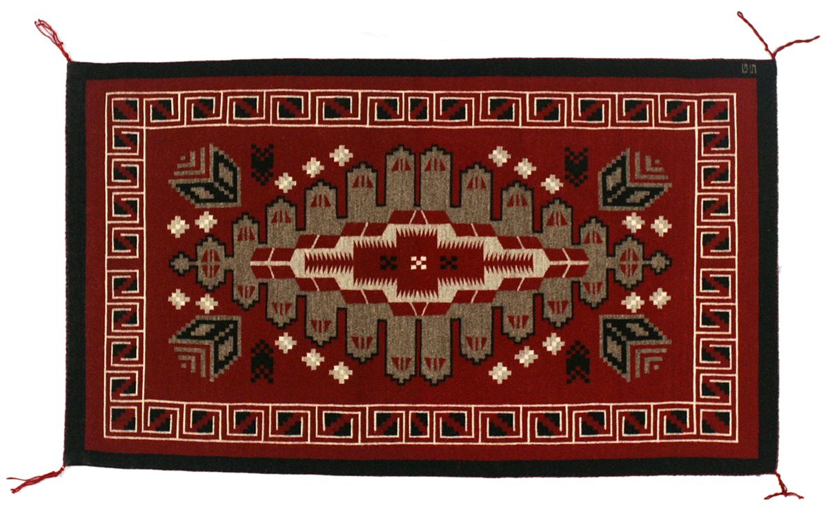 Navajo Weaving. 3'7' x 2'1". Ganado area tapestry weave. Stylized design in four colors. Woven by Genevieve Shirley & initialed in the border. Last quarter 20th century. Condition reports can be viewed at www.marchinmontana.com/docs/2013CR.pdf