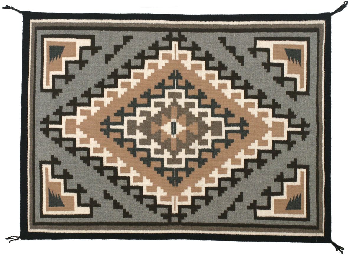 Navajo Weaving. 4' x 3'. Two Grey Hills area with central diamond design. Natural colors. Tight weave. Late 20th century. Condition reports can be viewed at www.marchinmontana.com/docs/2013CR.pdf