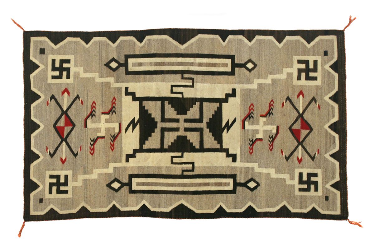 Navajo Weaving. 5'2" x 3'. J. B. Moore pattern. Crystal Storm design with six whirling logs and two water bugs. Natural colors with red highlights & an unusual red & yellow selvage. Circa 1910. Condition reports can be viewed at www.marchinmontana.com/docs/2013CR.pdf