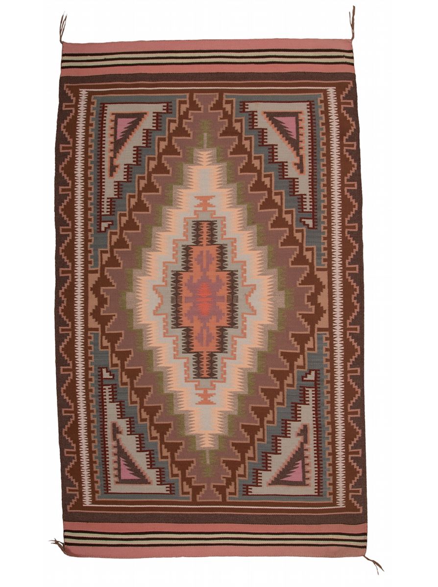 Navajo Weaving. 5'2" x 3'. Finely woven Burntwater area rug by Martha Duboise. This classic Burntwater regional weaving utilizes shades of turquoise, mauve, brown and white. Many of Martha's weavings appear to have an "inner glow", of which this piece is a fine example. Martha is the mother-in-law of Navajo weaver Stella Duboise. Circa 1970's.