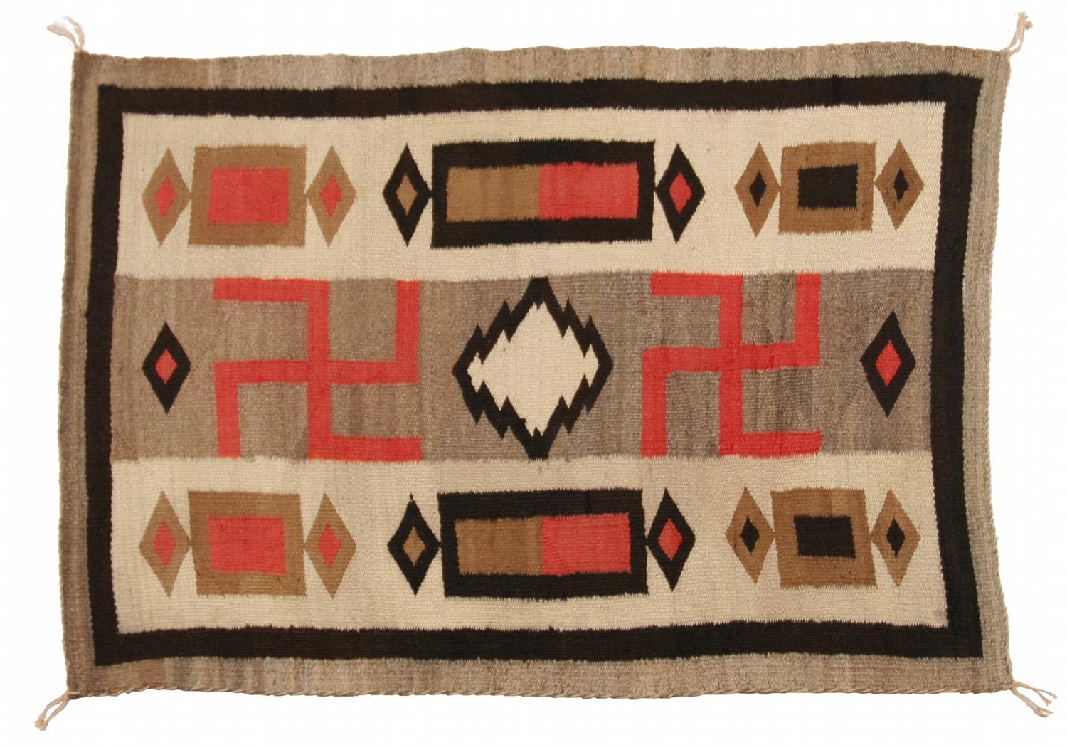 Navajo Weaving. 59" x 41". Whirling Logs. Woven with Native handspun Churro wool in J. B. Moore Crystal Trading Post area. Great floating elements, excellent condition. circa 1910. (est $700-1,000) Condition Report: No A/B sides. Excellent condition