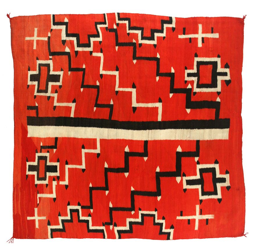 Navajo Weaving. 6'9" x 6'5". Possibly from the Hubbell Trading Post area. Woven from all long staple Churro wool. A bold geometric stepped design on a variegated red field. Circa 1890. Condition reports can be viewed at www.marchinmontana.com/docs/2013CR.pdf