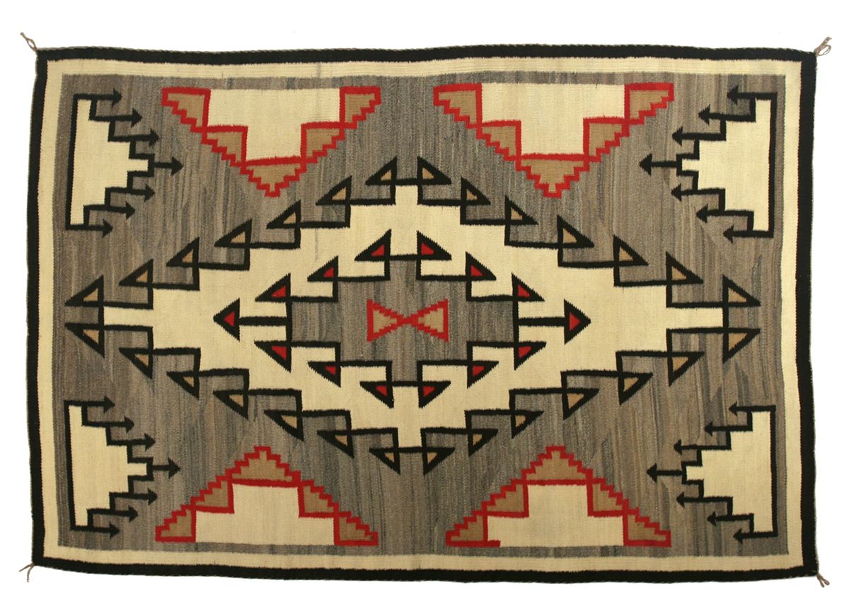 Navajo Weaving. 7'3" x 4'11". A beautiful, large floor rug from the Klagetoh area. Woven from all long staple Churro wool. Features a large, bold geometric diamond medallion with great storm clouds & rain corners. Circa 1920s. Condition reports can be viewed at www.marchinmontana.com/docs/2013CR.pdf