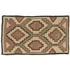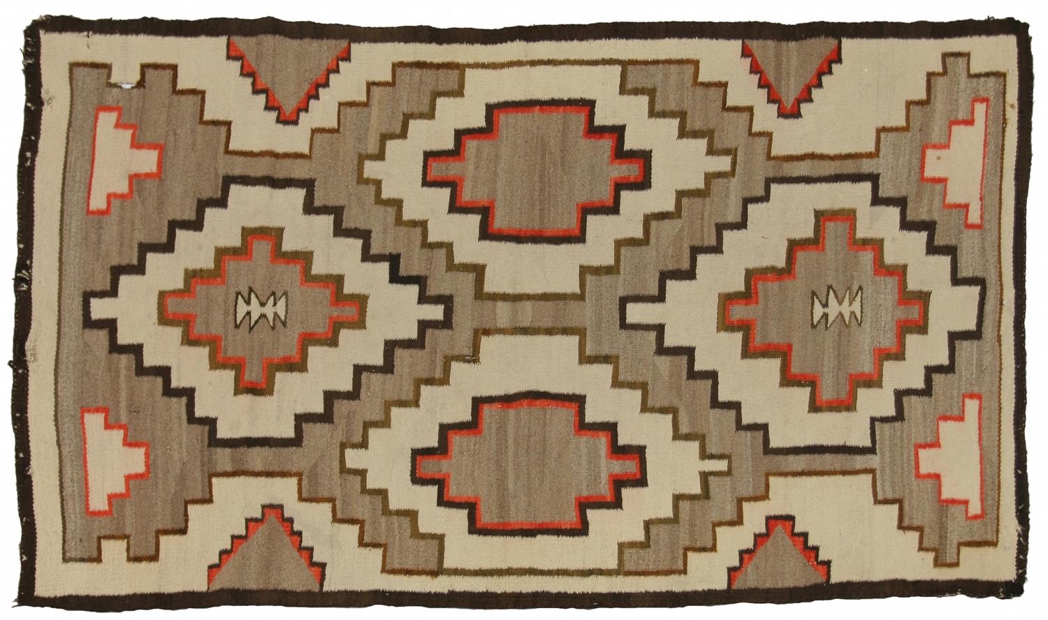 Navajo Weaving. 80" x 46". Diamond lattice pattern. Solid banded border. 1930s. Shows damage and needs cleaning. (est $1,000-1,500) Condition Report: No A/B sides. Red color is bright. Needs to be cleaned and selvage needs repair. Also, several small holes, but worth repaiing.
