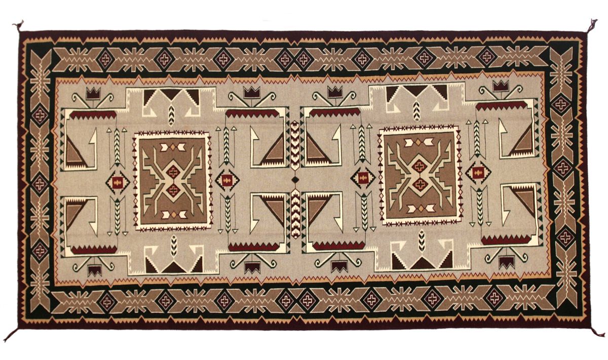 Navajo Weaving. 9'5" x 5'. Teec Nos Pos area. Churro wool. Great quality and size. Elements include water bugs & feathers. Color palette is wonderful. Woven by Cecelia Nez. Last quarter 20th century. Condition reports can be viewed at www.marchinmontana.com/docs/2013CR.pdf