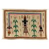 Navajo Yei Weaving. 4'3" x 3'3". Solitary figure surrounded by corn stalks and enveloped in a Rainbow Guardian. Unusual color combination. Circa 1960s.