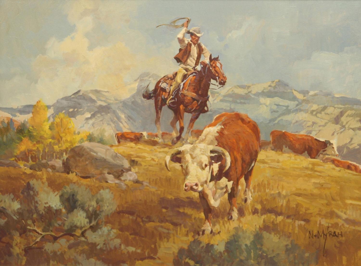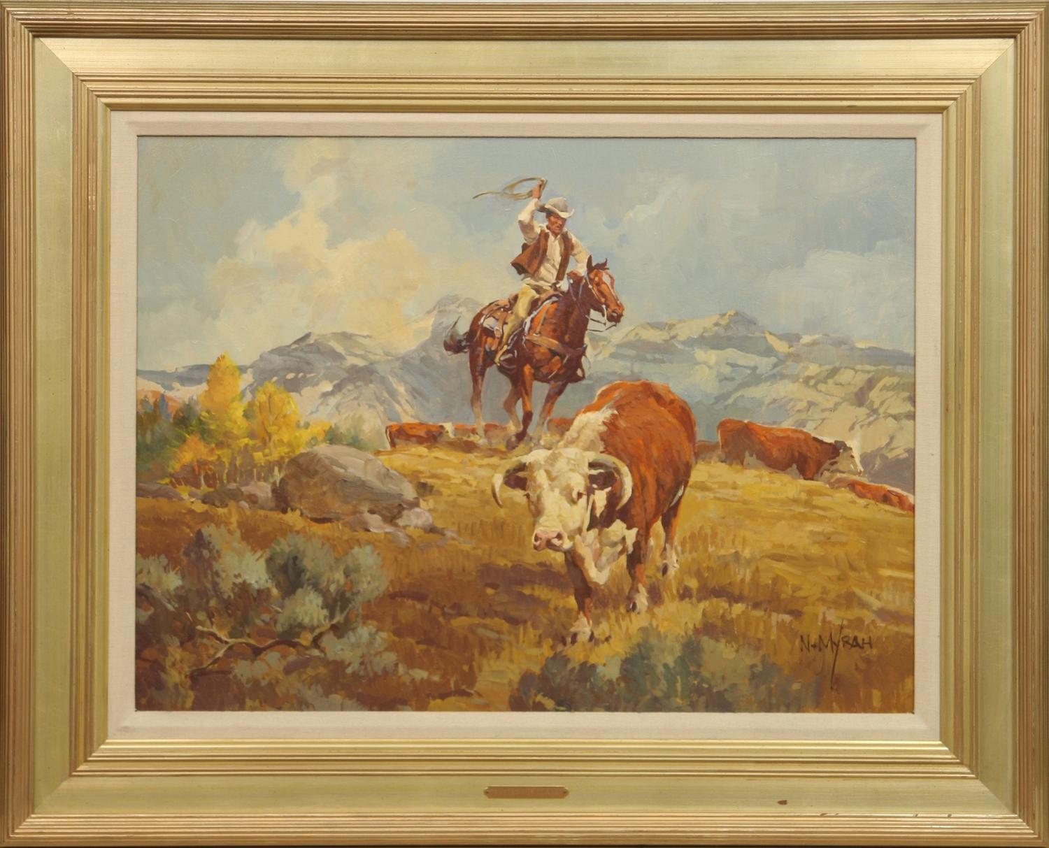 Newman Myrah (1921-2010). Taking His Leave. 18" x 24" oil on canvas. signed lower right. (est $2,500-4,500) Condition Report: Black lights clean. Framed nicely