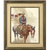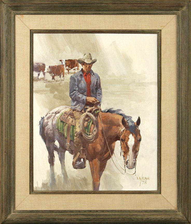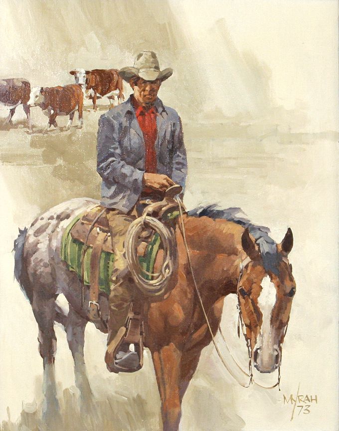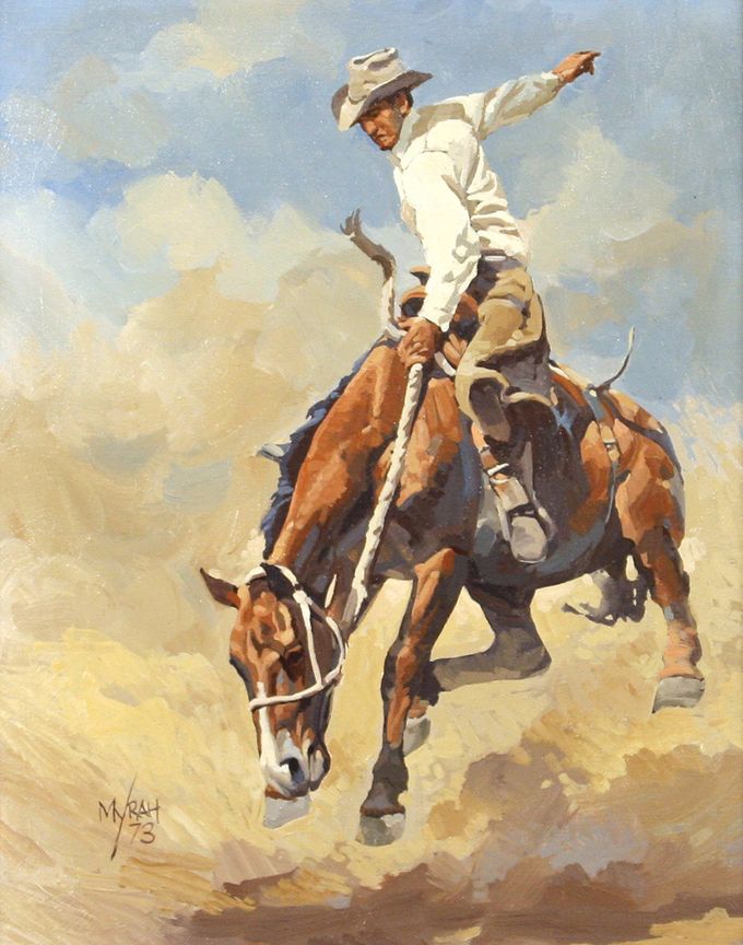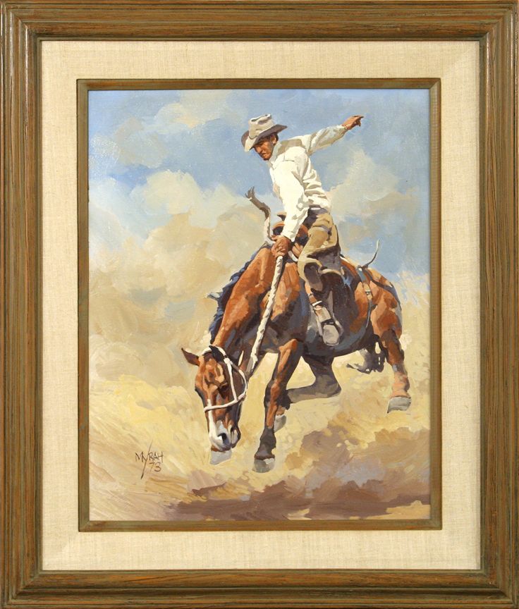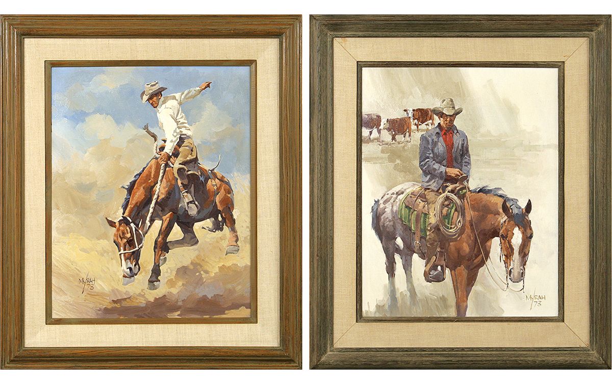 Newman Myrah (1921 - 2010). Two paintings: Bronc Rider. 20" x 16" oil on canvas. Signed lower left: MYRAH 73. Cattleman. 20" x 16" oil on canvas. Signed lower right: MYRAH 73. Condition reports can be viewed at www.marchinmontana.com/docs/2013CR.pdf