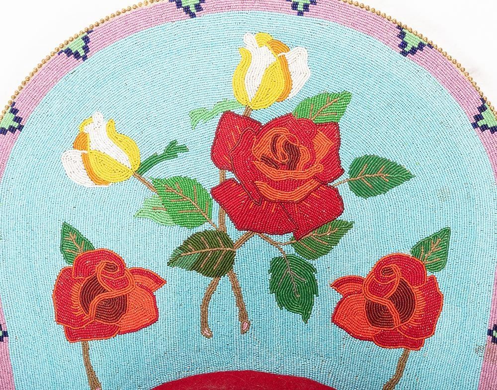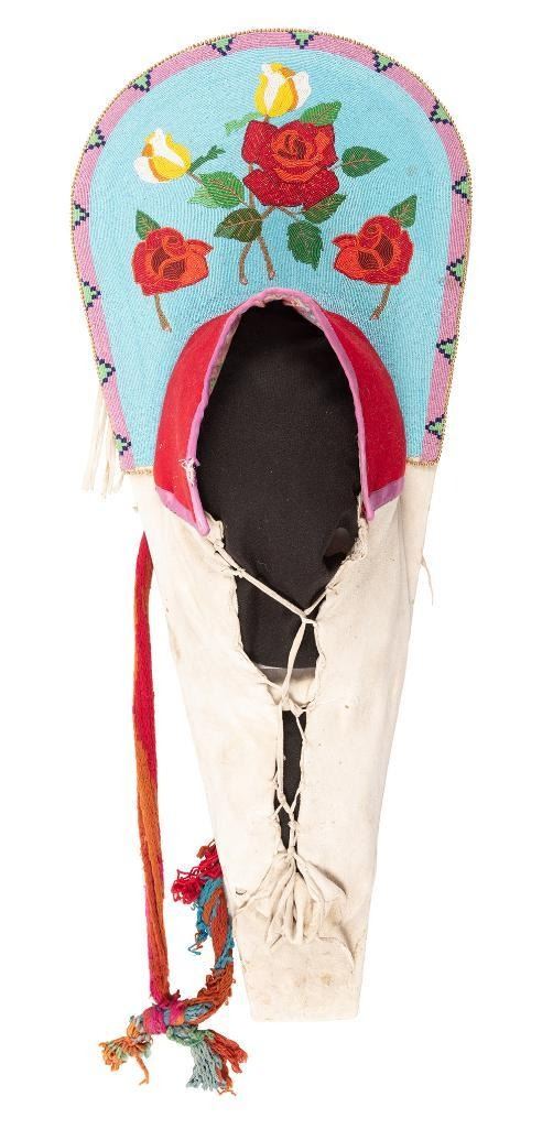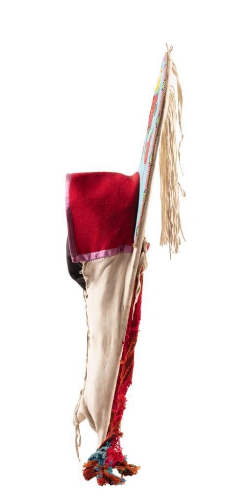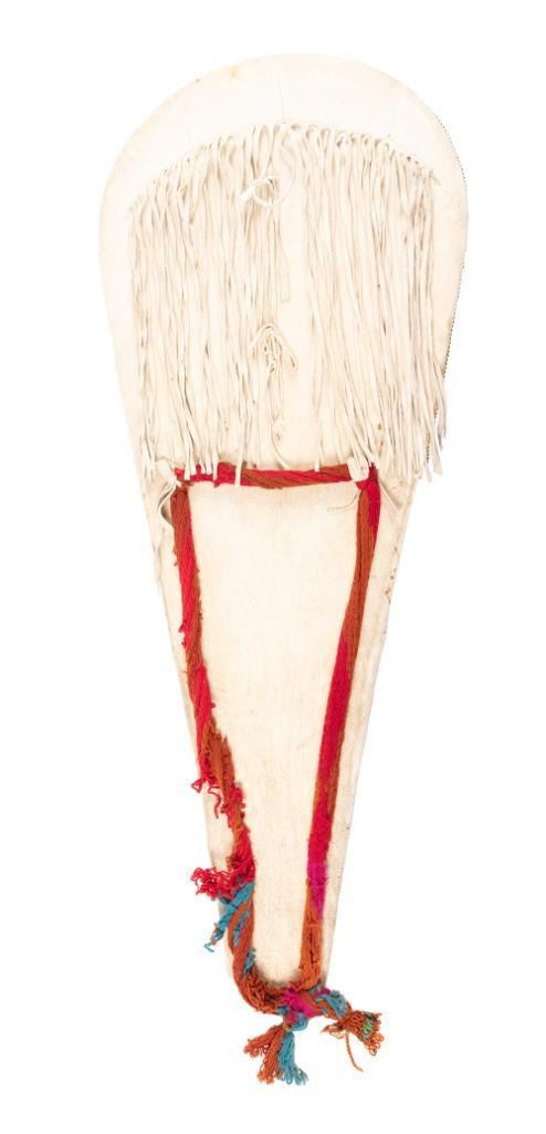 37" tall overall x 15" at widest point. Accented with 13" fringe, trade cloth. Old tag states: Nez Perce, Jeanette Sequints says this board was made by Elizabeth Green (now blind) (1960) and past 80.