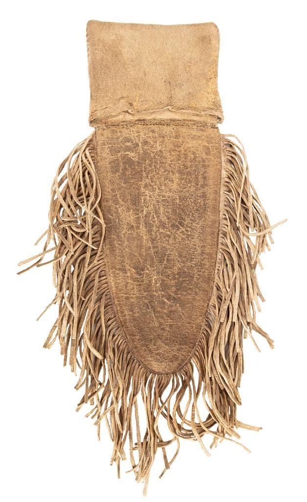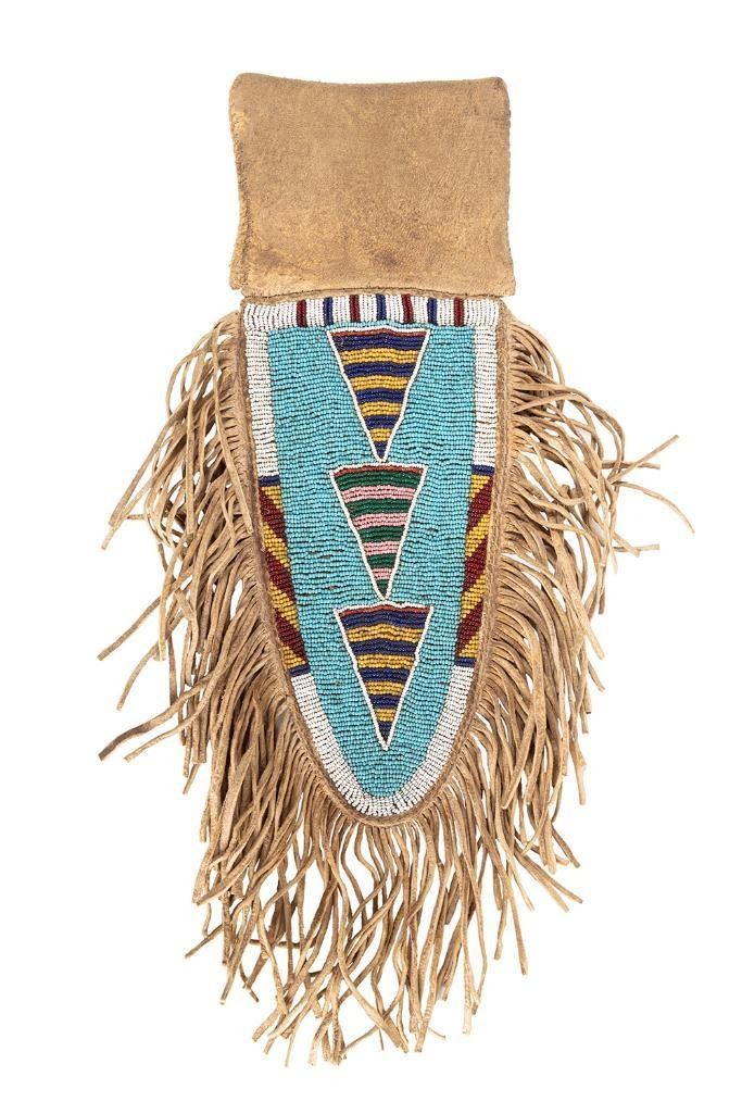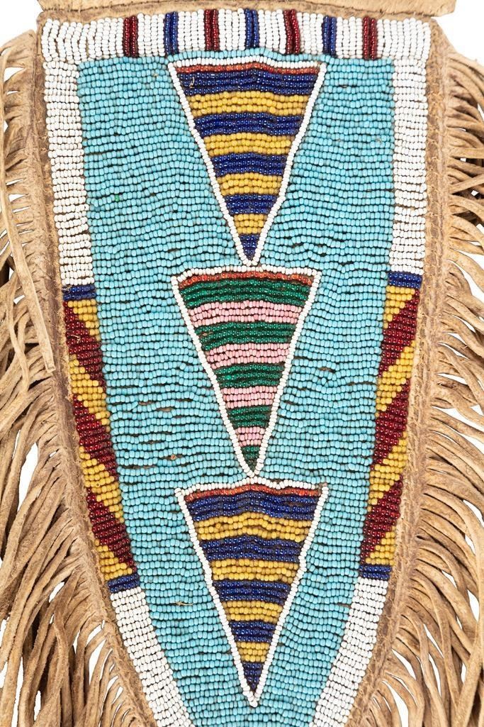 9.5" x 5" accented with fringe. Sinew sewn and beaded on Native tanned hide. Circa 1885.