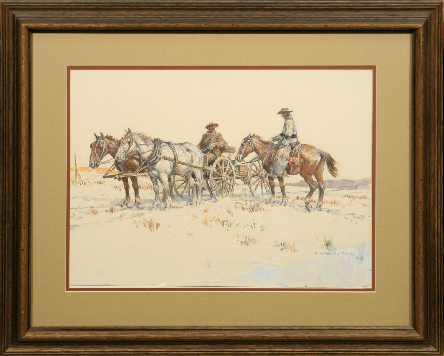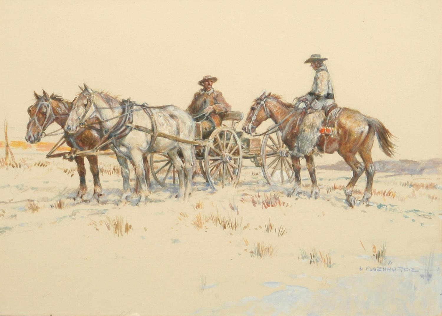 Nick Eggenhofer (1897-1985), CAA. Cowboy Conversation. 15" x 20" gouache. signed lower right. (est $4,000-6,000) Condition Report: Crisp and clear. Distressed wood frame