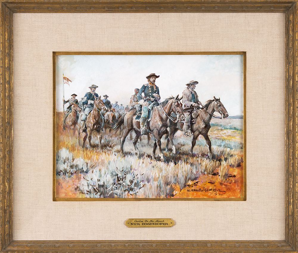 Nick Eggenhofer (1897-1985). Custer on the March. 11" x 14" gouache. Signed and dated '62 lower right. Verso: Old Arizona West Galleries, Inc. (Scottsdale, AZ) sticker.