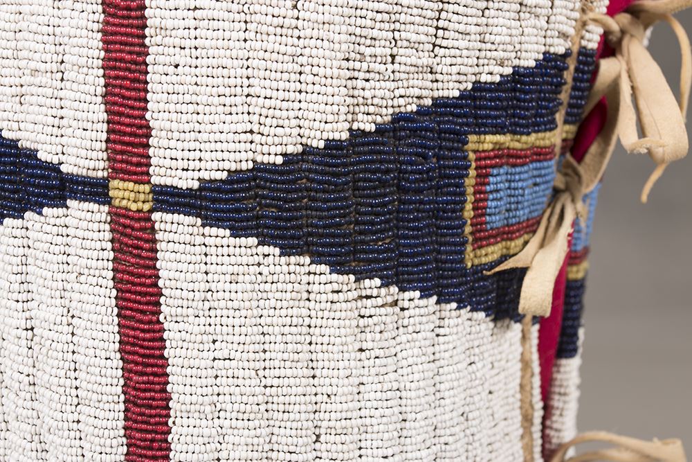 Northern Cheyenne Fully Beaded Cradle. 38" long including original, hand-made tacked and forked boards. 9 ½" wide. Classic hourglass patterns and colors, including white-heart reds, two shades of blue and yellow on a white background. Circa 1880. Provenance: Morning Star Gallery, Santa Fe purchase.