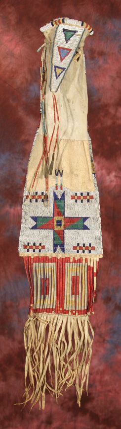 Northern Plains Pipebag. 18.5" with 5" quilled slats & 8" fringe. A 6" fully beaded tab with 5" quilled tassels terminating in tin cones decorates the front. Nice, early bag with classic designs. 19th century. provenance: Collection of Dr. Delwin & Karen Bokelman, PA., & pictured in their book Precious Dreams, page 6 Condition reports can be viewed at www.marchinmontana.com/docs/2013CR.pdf