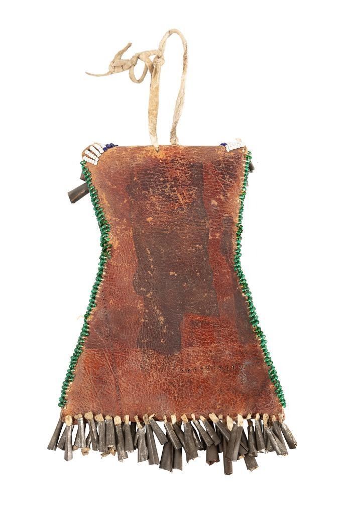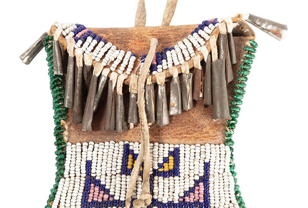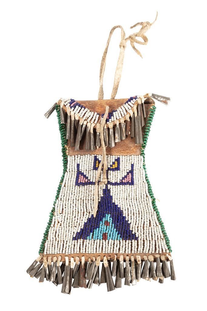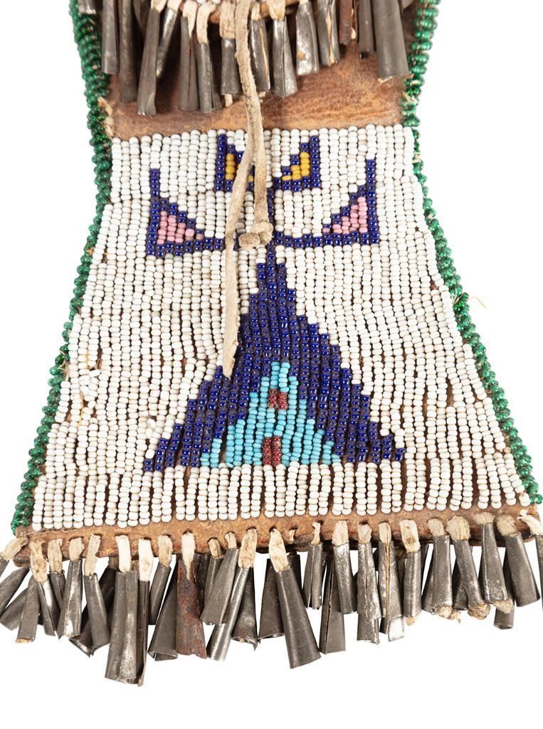 6.5" overall x 4.5" wide. Accented with tin cones, beaded in geometric designs. Late 19th century.