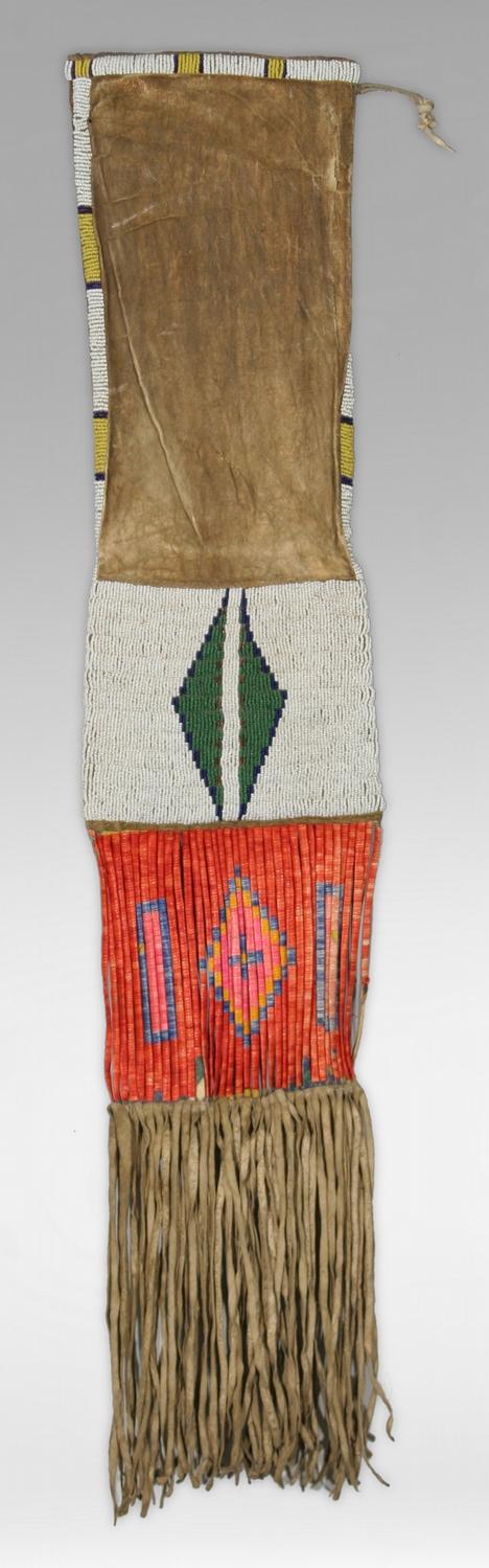 Northern Plains Beaded and Quilled Pipe Bag. 36" long, 7 ½" wide. 19th century, excellent condition. (est $2,000-3,000) Condition Report: Hide is discolored from age and use. Beadwork is intact and in excellent condition. Quillwork was done over parfleche slats and is generally excellent with minor losses