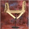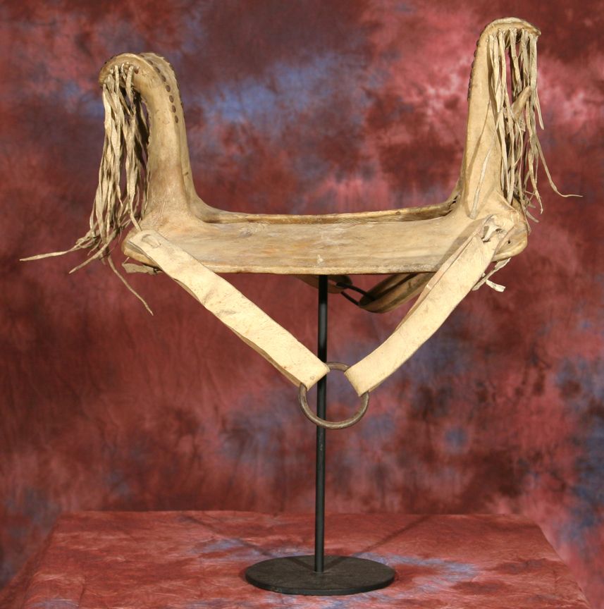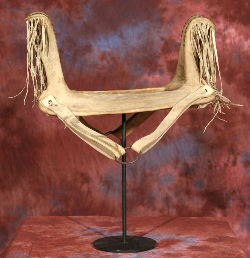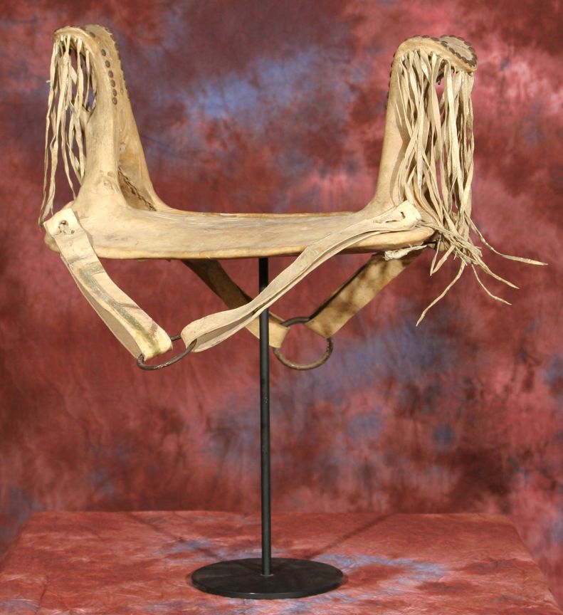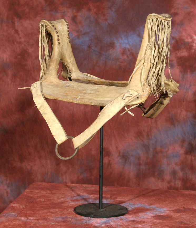 Northern Plains Child's Saddle. 17" x 18.5". Tacked designs on rawhide. Frame appears to be elk horn. 19th century. Provenance: Collection of Dr. Delwin & Karen Bokelman, PA. Condition reports can be viewed at www.marchinmontana.com/docs/2013CR.pdf