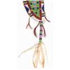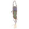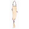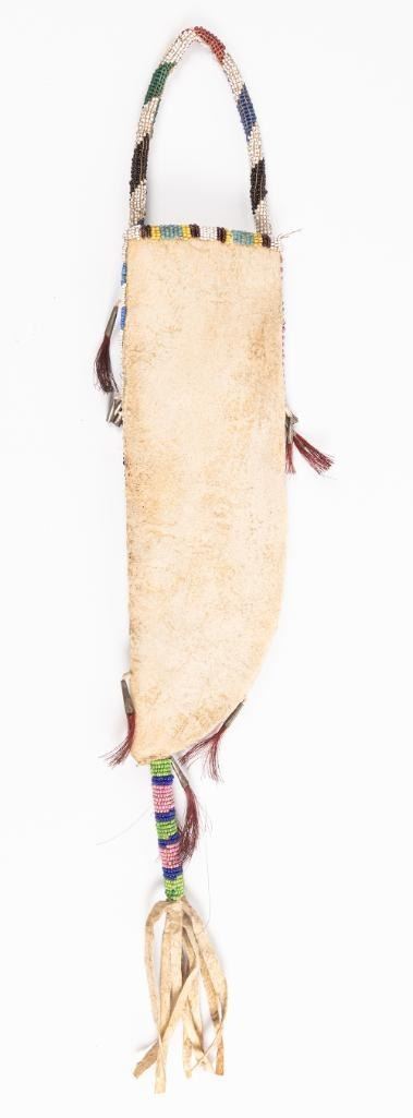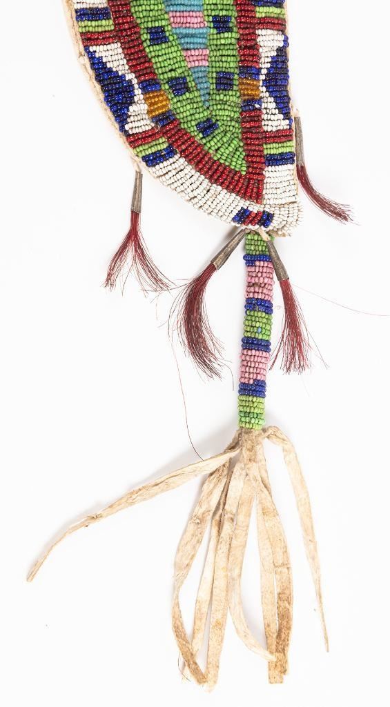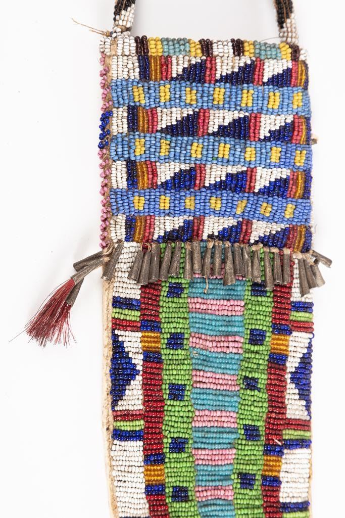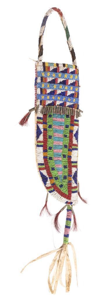 21" long overall including hanger and fringed and beaded drop. Beautifully beaded with intricate designs, accented with dyed horsehair stuffed tin cones. Lined with parfleche. 20th century.