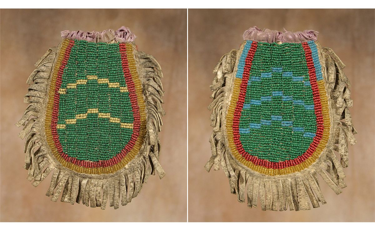 Northern Plains Medicine Pouch. 5" x 4" with different patterns beaded on each side in colors of translucent blue, white-heart red, green, solid & translucent yellow. Finished off with 1" of fringe & purple cloth. 19th century. Condition reports can be viewed at www.marchinmontana.com/docs/2013CR.pdf