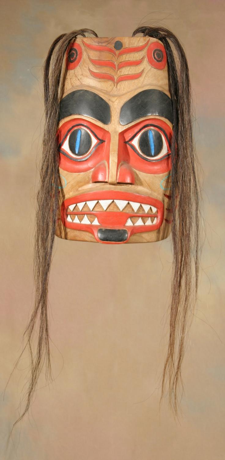 Northwest Coast Mask. Carved by A. Fencepost (deceased). 17" x 12". Nicely painted. Late 20th century. (est $1,000-2,000) Condition Report: Wood is discolored from age, but in fine condition. Hair is all intact and paint is bright