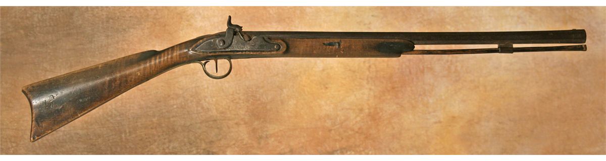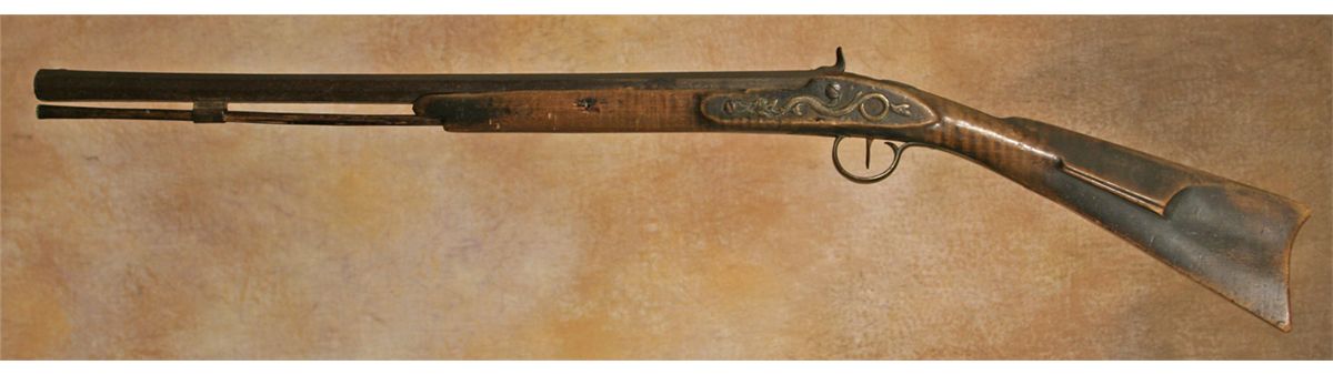 Northwest Trade Gun. Large calibre, 25" octagonal sawed off barrel. Cap & ball converted flintlock rifle. Brass trigger guard with a brass dragon-form side plate. Lock plate marked TRULOCK. Wooden ramrod. 18th century (converted later). Condition reports can be viewed at www.marchinmontana.com/docs/2013CR.pdf