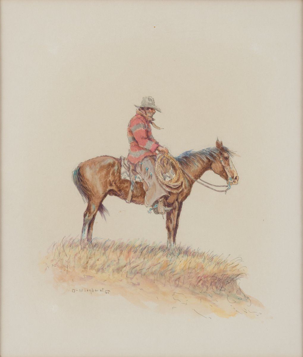 Olaf Wieghorst (1899-1988). Windy Ride. 13 ¾" x 11 ¾" mixed media. Signed lower left.
