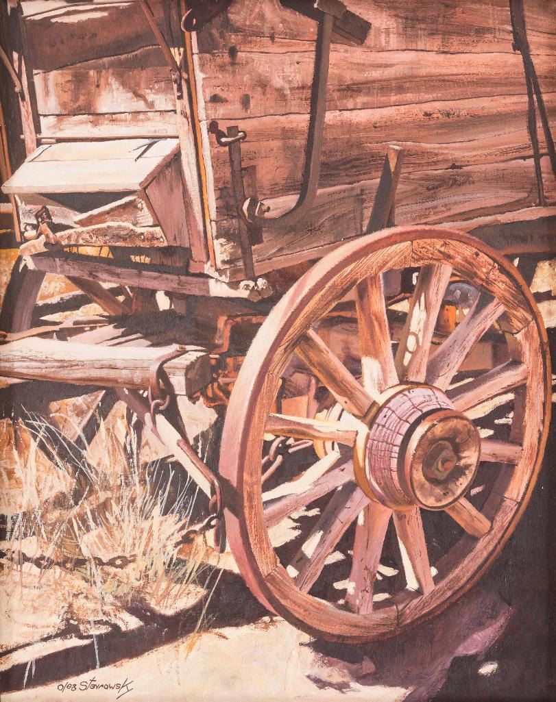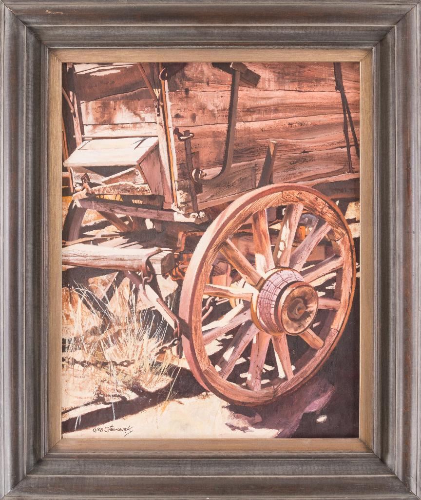 Oleg Stavrowsky (1927 - ) Stilled Wheel 25" x 20" oil on canvas Signed lower left Verso: Titled and signed. $1,000-2,000