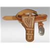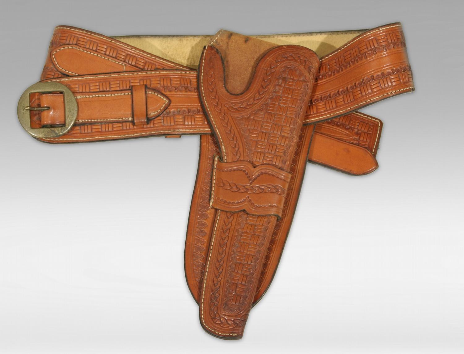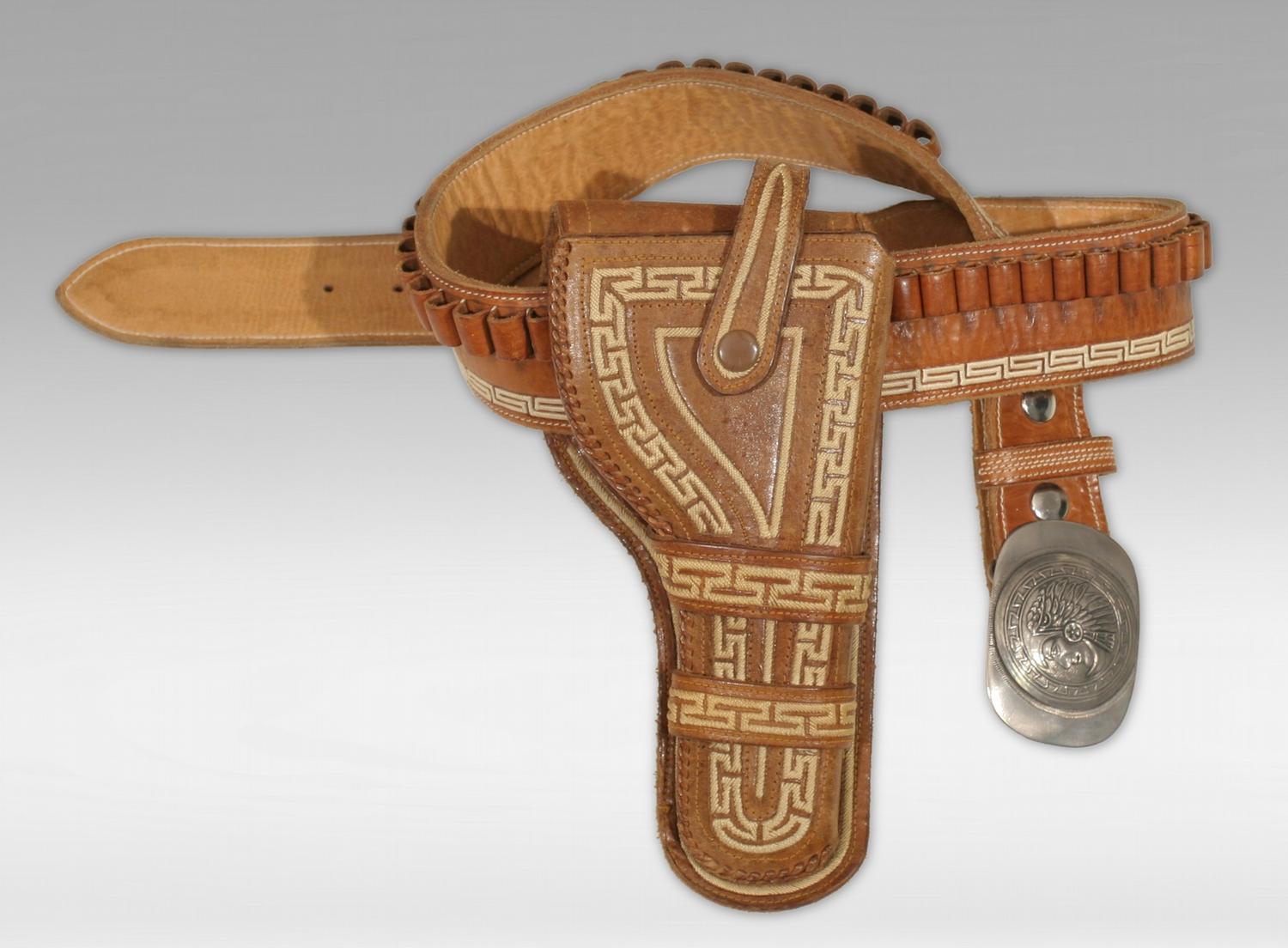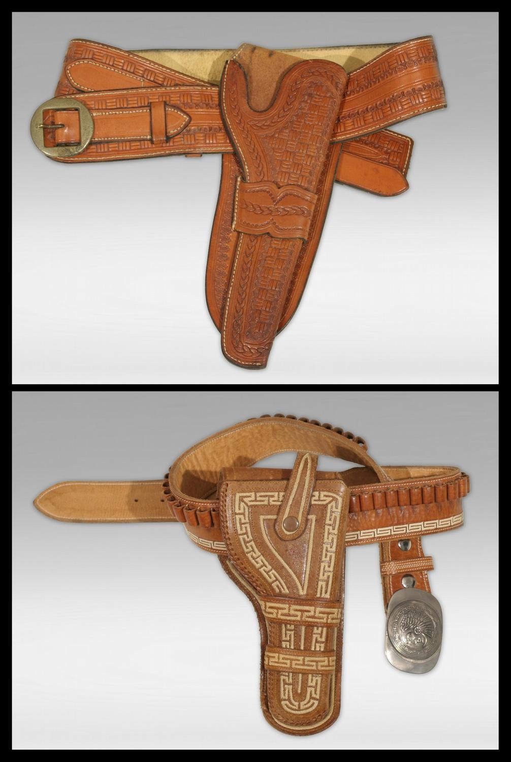 Pair of Gun Rigs. (1) M. Bradford Slim Jim Holster Rig. For a 7 ½" Colt, 45" long. (2) Mexican Charro Gun Rig. Piteado Embroidery, 48" long, 5 ½" holster. circa 1930's. (est $400-600) Condition Report: #1 in fine condition. #2 slightly discolored from age and use. No damage