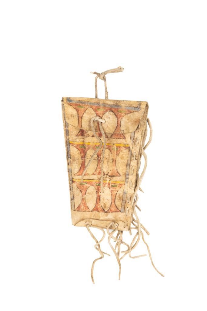 8.5" x 5" at widest point. Painted in geometric red, green, yellow and blue designs, accented with fringe along two sides and a tie at the top. 19th century.