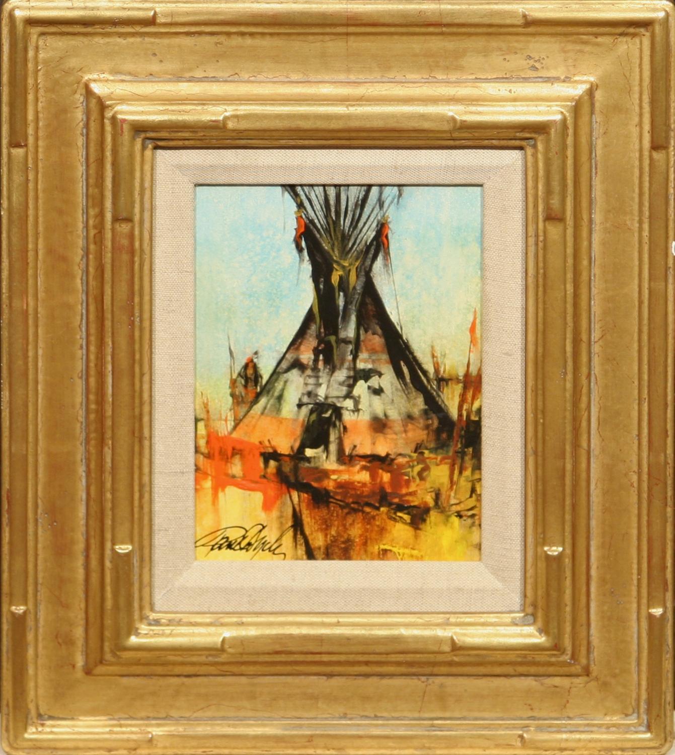Paul Dyck (1917-2006). Set of Three Paintings. (1) Blackfoot Lodges. 5" x 7" watercolor & acrylic on board. signed lower right, signed & dated 1982 verso. (2) Crown Of Sage. 8" x 12" oil on board. signed lower left, signed & dated 1973 verso. (3) The Sun Lodge. 7" x 5" watercolor & acrylic on board. signed lower left, signed & dated 1982 verso. (est $2,000-3,000). Provenance: Eiteljorg Museum of American Indians & Western Art, Indianapolis, IN Condition Report: All black light clean. All nicely framed