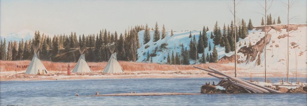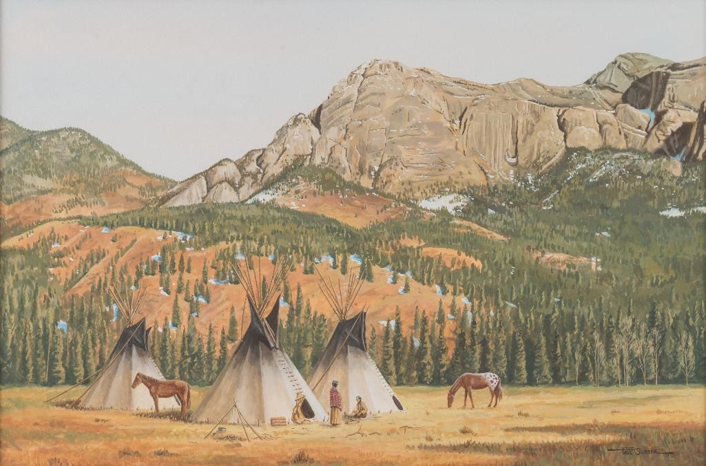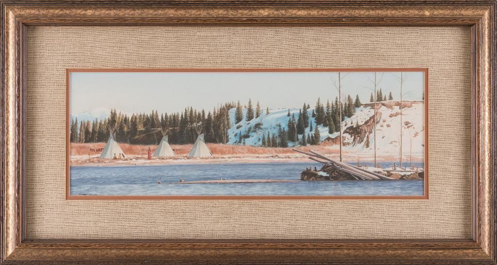 Paul Surber (1942 - ) Two works: 1) River Encampment, 1978 8.25" x 23.75" gouache Signed and dated '78 lower left 2) Camp Near the Foothills 11.5" x 17.5" gouache Signed and dated '78 lower right $800-1,000