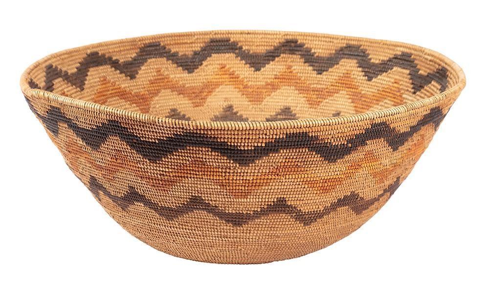19" diameter x 7" tall polychrome basket with zigzag patterns. 20th century.