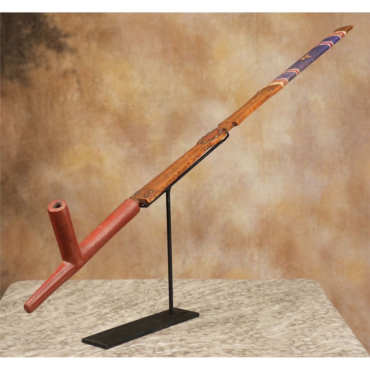 Pipe and Stem. 9.5" x 4.5" T-shaped catlinite bowl. 26.75" carved stem, decorated in plaited quillwork and tacks. 19th century.