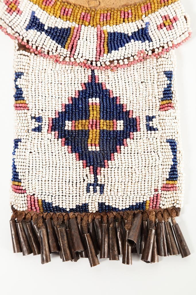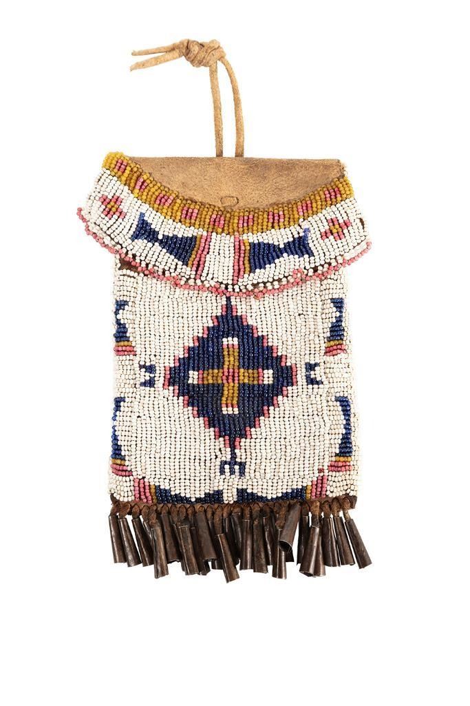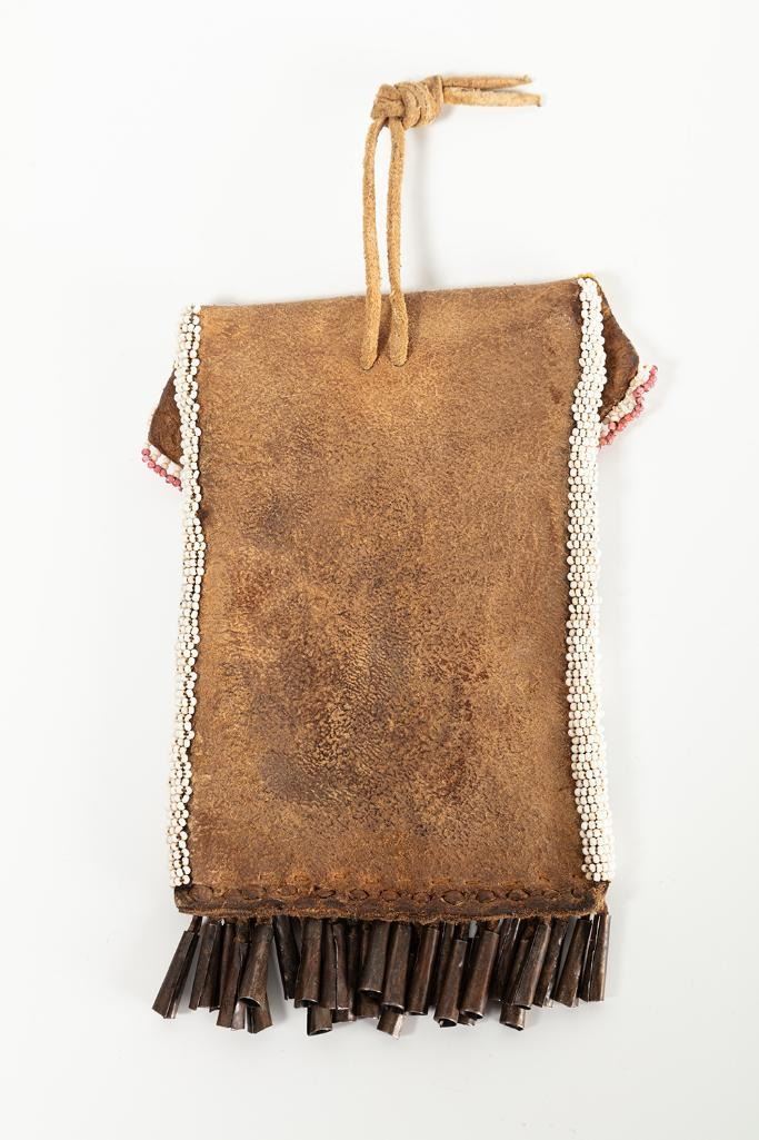 5.5" x 4" geometrically beaded on Native-tanned leather, embellished with tin cones and top tie. Circa 1890.