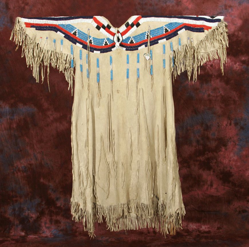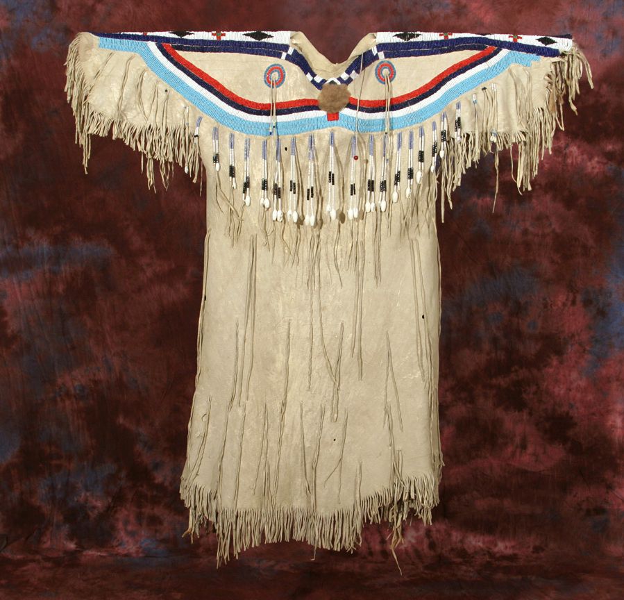 Plateau Dress. 48" x 45". Decorated with pony beads in classic colors. Accented with beaded drops, abalone disks, shells & hide. Lots of fringe. Late 19th-early 20th century. Provenance: Collection of Dr. Delwin & Karen Bokelman, PA., & pictured in their book Precious Dreams, page 16. Condition reports can be viewed at www.marchinmontana.com/docs/2013CR.pdf