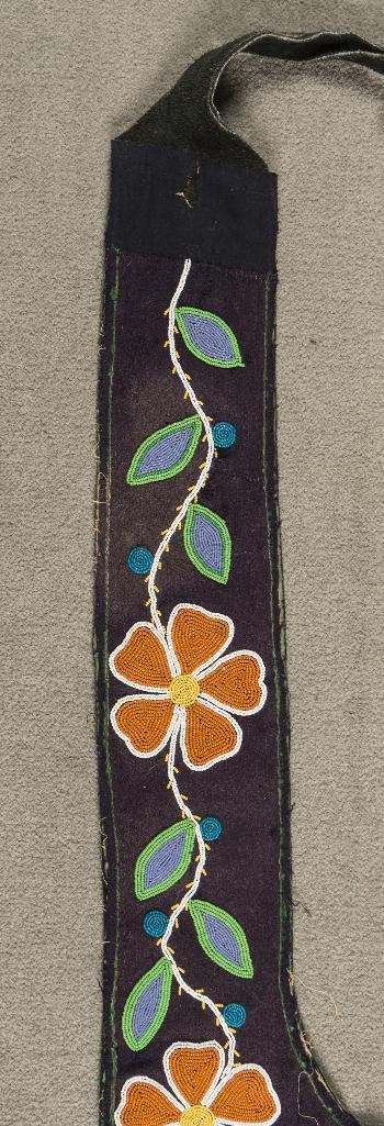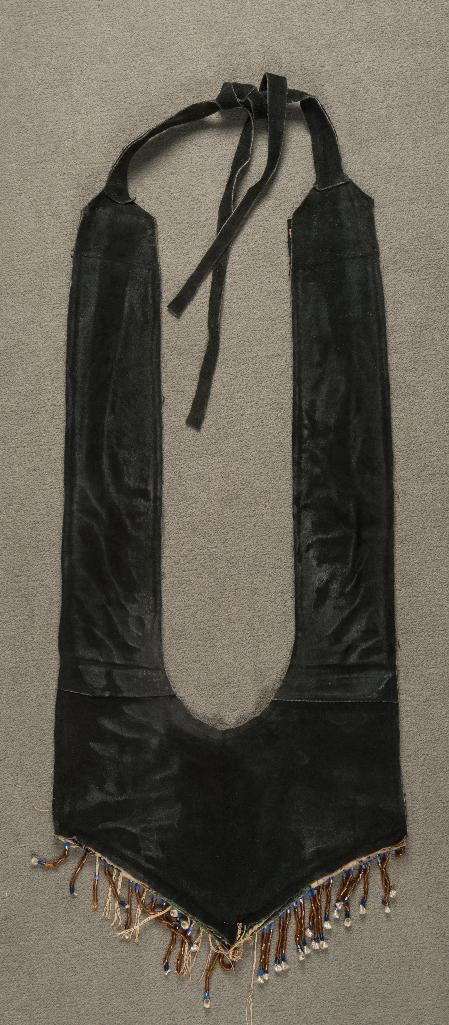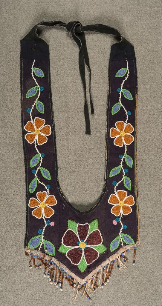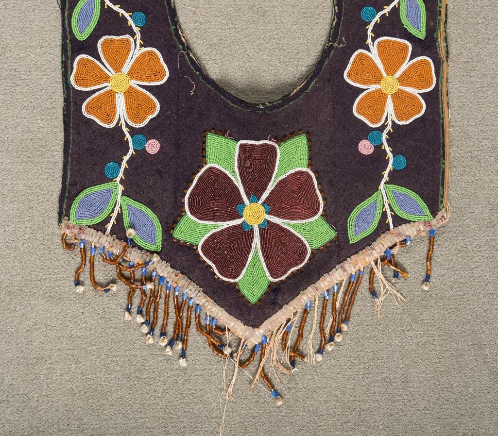 Plateau Beaded Martingale 39" long x 15" wide with floral beaded designs on blue trade cloth. Accented with beaded drops terminating in mini iridescent small seashells. Circa 1915. $1,500-2,000 Provenance: Ex Bokelman Collection.