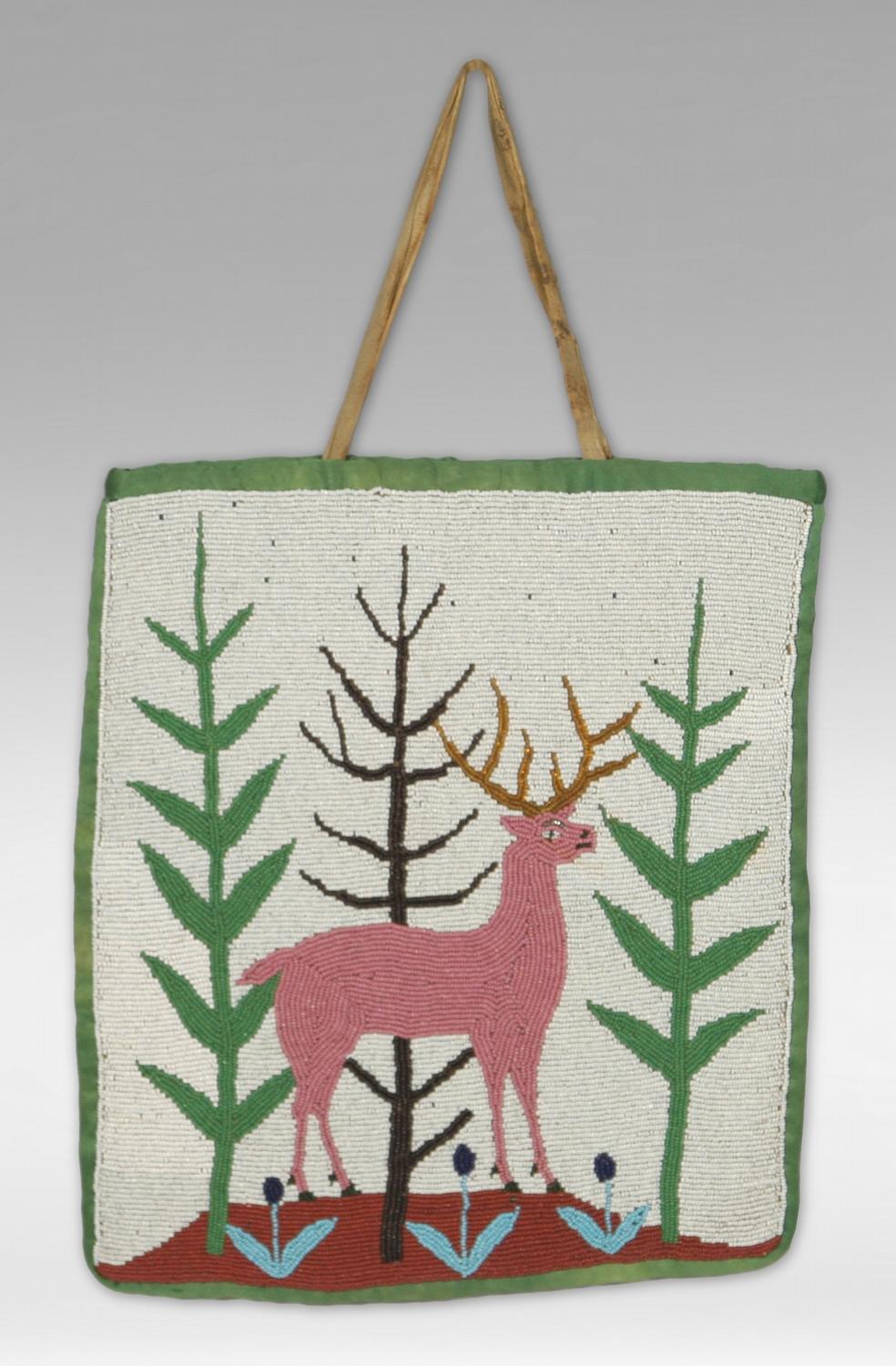 Plateau Elk Dreamer's Society Beaded Bag. 12" long. Wonderful pictorial designs. Circa 1950's. (est $1,500-2,000) Condition Report: Cloth and beadwork all in excellent condition
