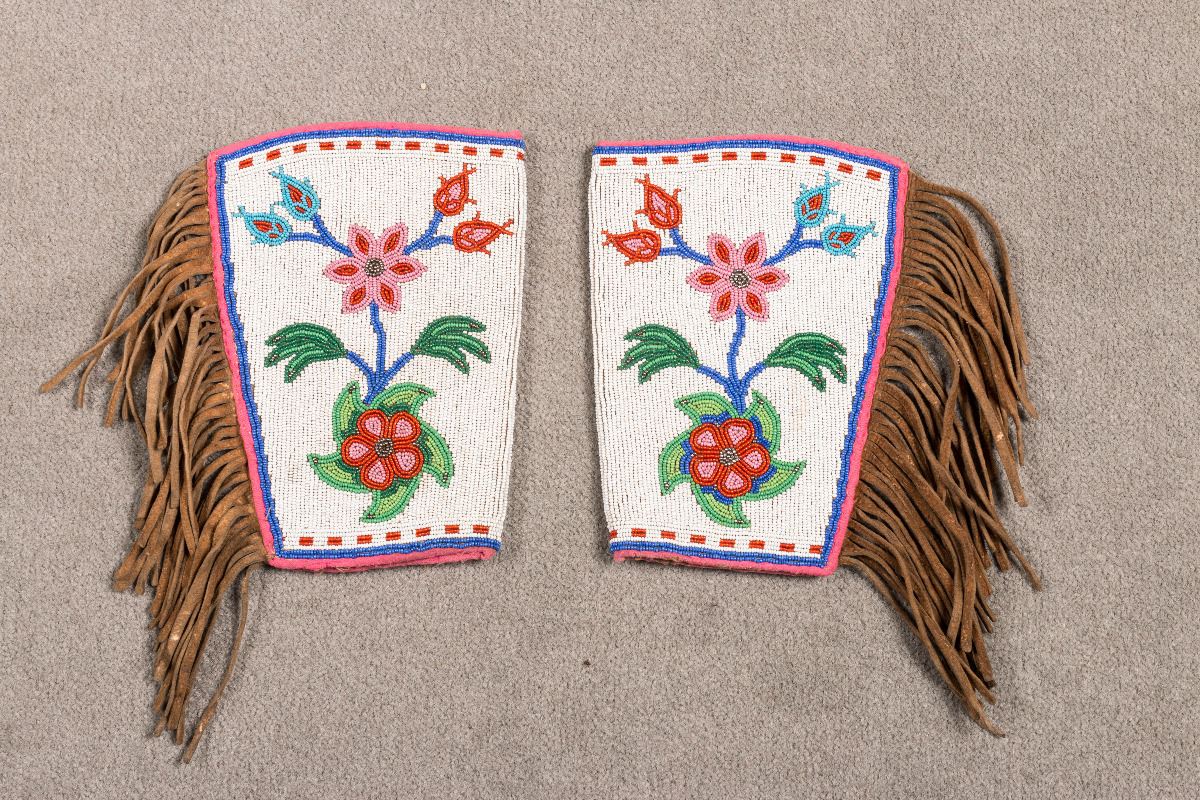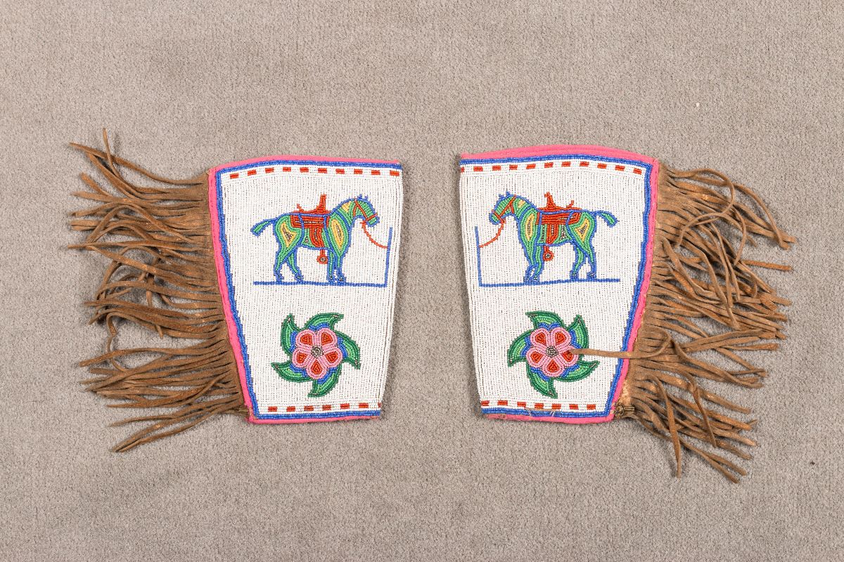 Plateau Fully Beaded Pictorial Cuffs. 8" long x 6" at widest point with horse pictorials and floral designs. Trimmed with pink trade cloth and accented with 4 ½" fringe. Circa 1890s.