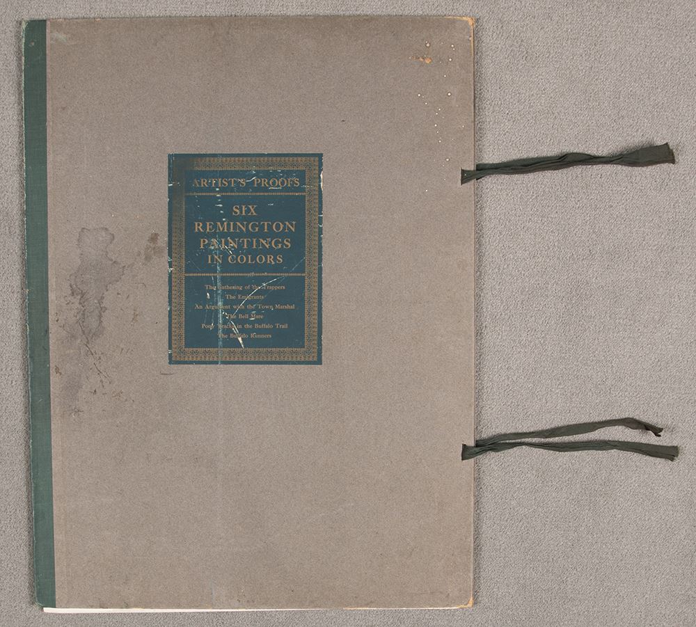 Portfolio of 6 Frederic Remington Prints dated 1904. The Gathering of the Trappers, The Emigrants, An Argument with the Town Marshall, The Bell Mare, Pony Tracks in the Buffalo Trail, The Buffalo Runners.