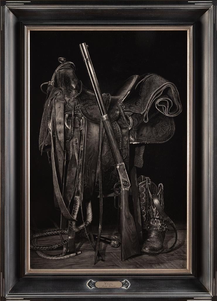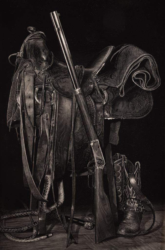 Verso: Artist sticker - "This saddle belonged to George Shadbolt, owner of the Churn Ranch south of Merriman, NE.