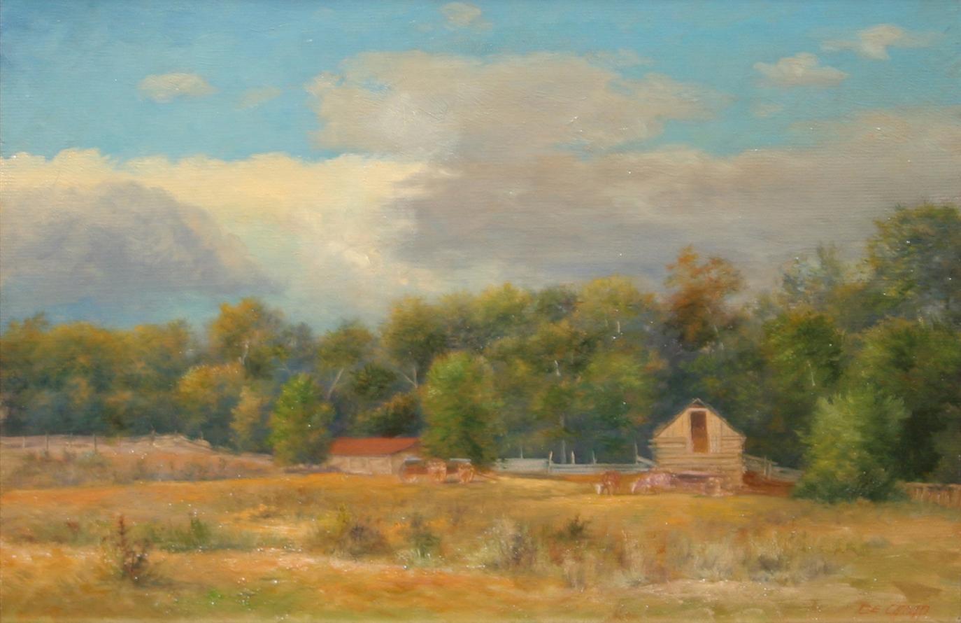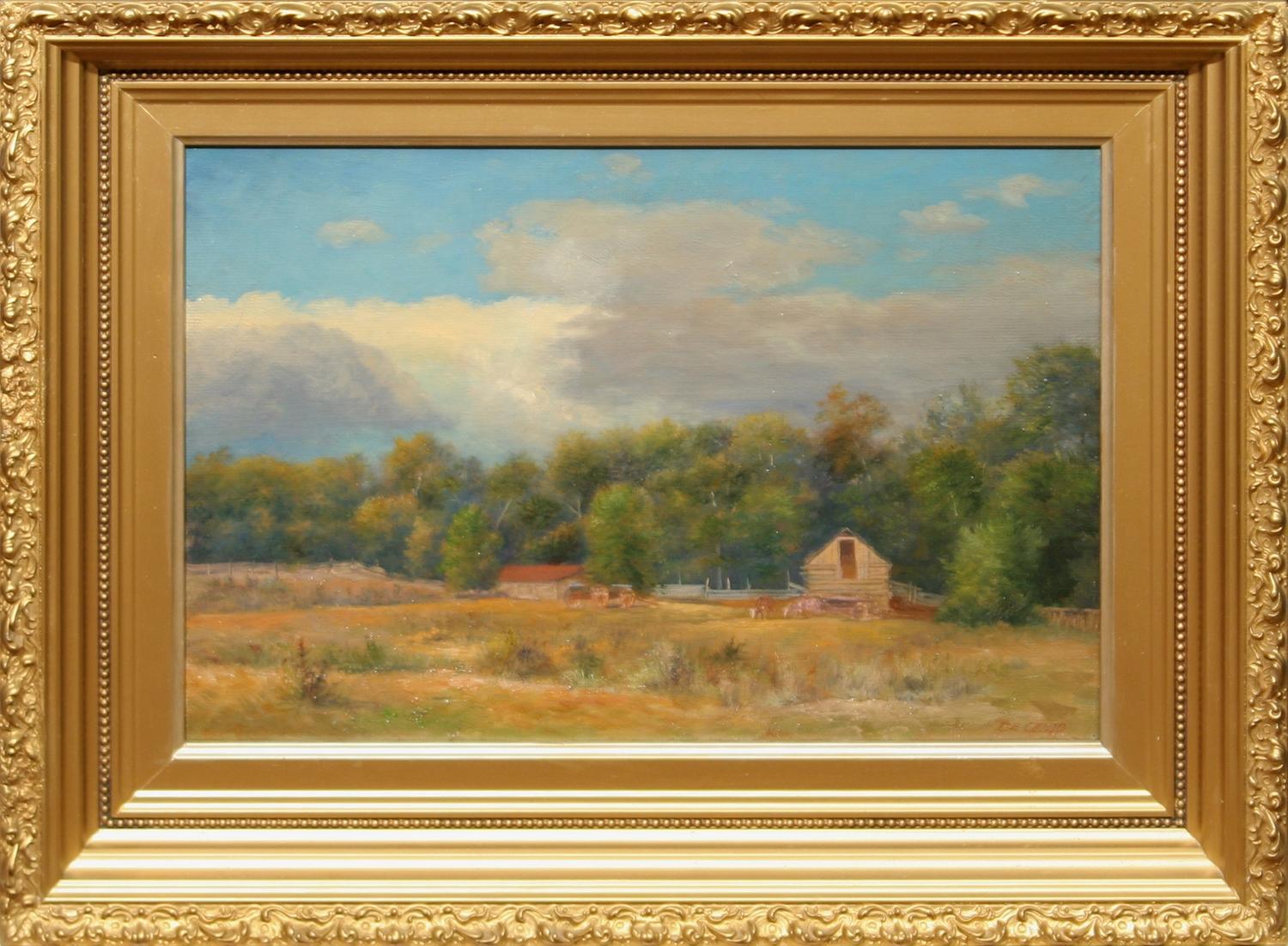 Ralph Earl DeCamp (1858-1936). Stormy Day - Ranch On 16 Mile Creek. 14" x 20" oil on canvas. signed lower right. (est $2,500-3,500) Condition Report: Black lights clean