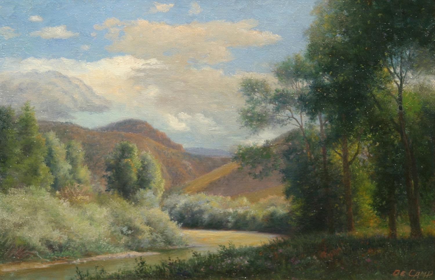 Ralph Earl DeCamp (1858-1936). Sunshine And Shadows On 16 Mile Creek. 14" x 20" oil on canvas. signed lower right. (est $2,500-3,500) Condition Report: Black lights clean