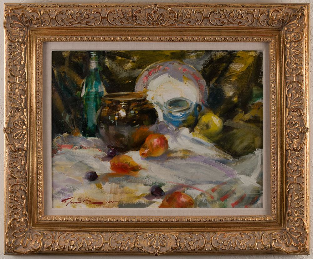 Ramon Kelley (1939 - ) (OPA). Still Life with Red Pears. 18" x 24" oil on canvas. Signed lower left: Ramon Kelley © OPA. Verso: Signed and titled.