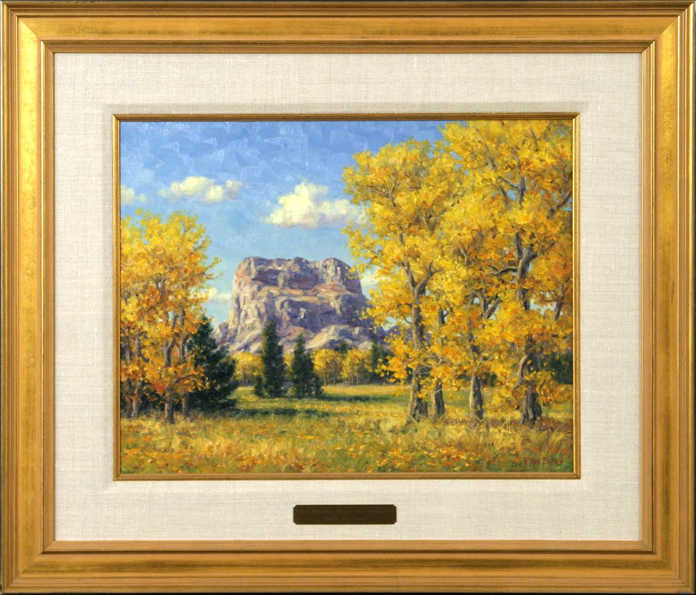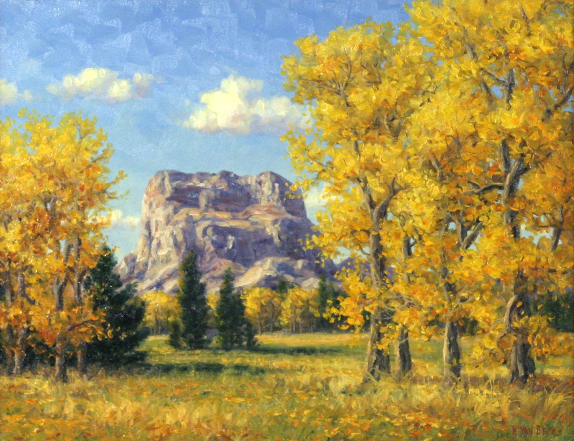 Randy Van Beek (1958 - ). Chief Mountain Through The Cottonwoods. 14" x 18" oil on canvas. Signed lower right: R. VAN BEEK. Condition reports can be viewed at www.marchinmontana.com/docs/2013CR.pdf