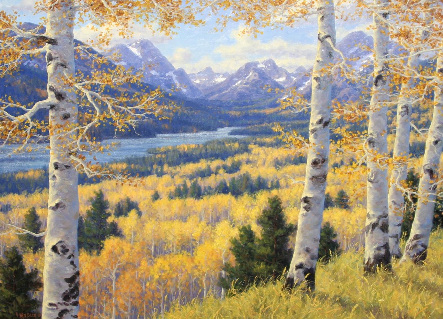 Randy Van Beek (b. 1958). October At Two Medicine Lake. 30" x 40" oil on linen. signed lower left. (est $6,000-$8,000) Condition Report: Black lights clean. Nicely frame in gold frame