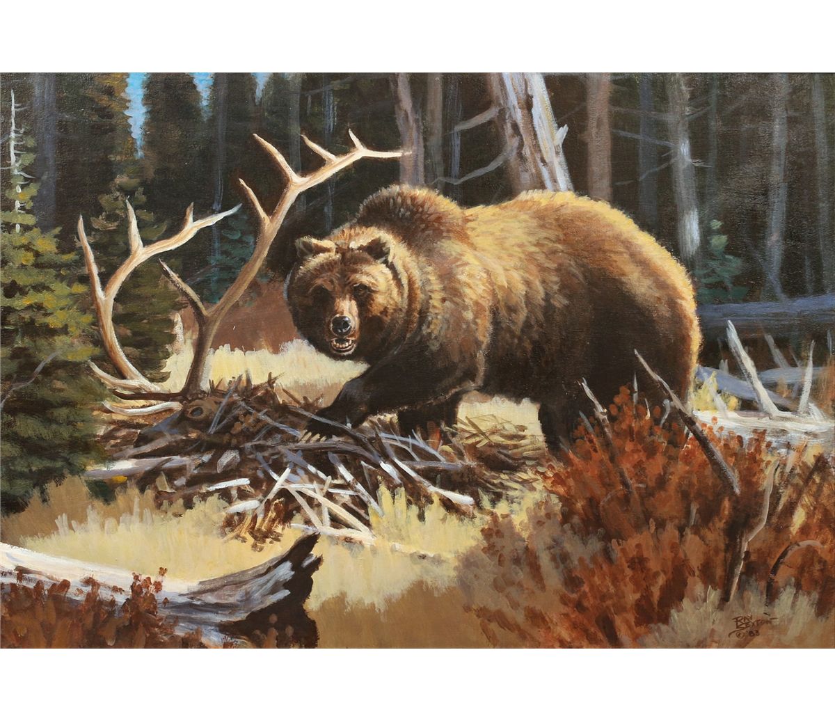 Ray Sexton (1959 - 1996). Covering the Kill - Grizzly Bear. 19" x 27" oil on board. Signed lower right: RAY SEXTON © '83.