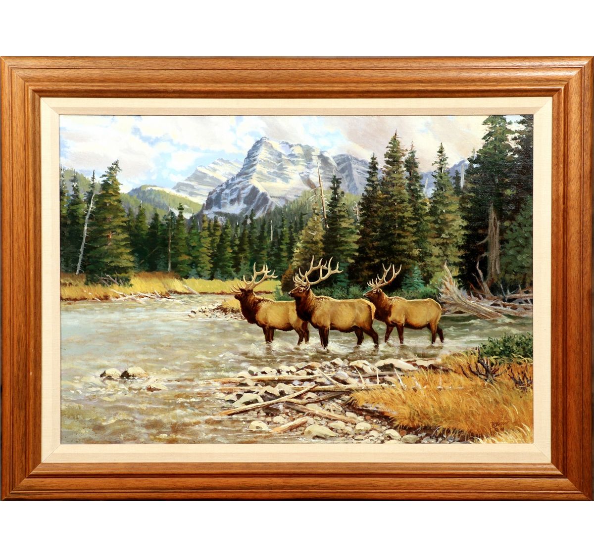 Ray Sexton. Elk Crossing. 20" x 28" oil on canvas. Signed lower right: RAY SEXTON © 88.