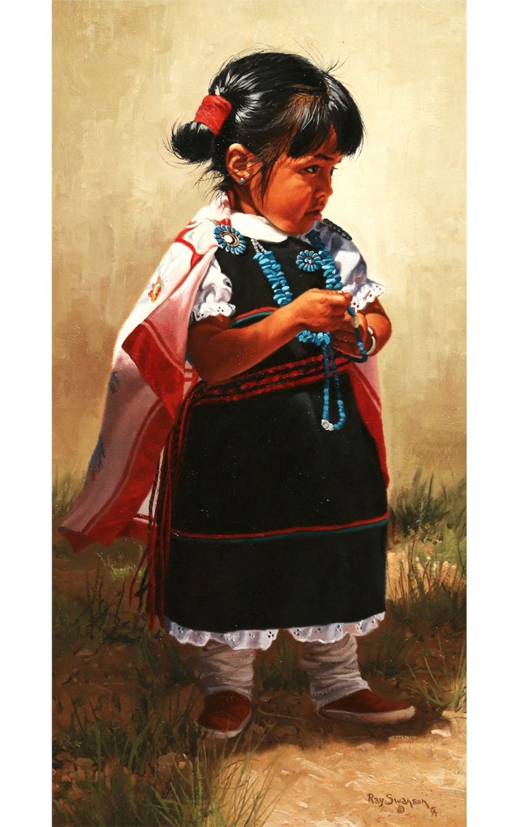 Ray Swanson (1937 - 2004) CA. Hopi Innocence. 24" x 12" oil on board. Signed lower right: Ray Swanson © CA. Verso: titled and signed.